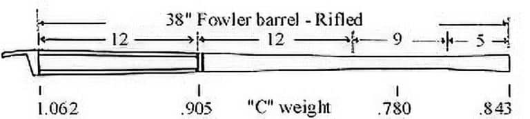 The Fowler Rifled is a 38″ barrel which is excellent for a sporting rifle. .58 Caliber, C weight, 1:66 twist.